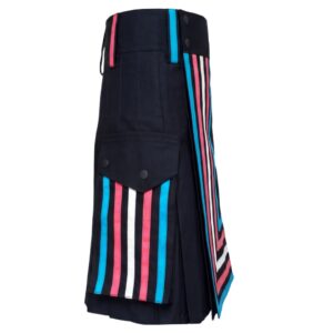 Black Cotton Pride Kilt for Men – Trans Stripe Hybrid Utility Kilt with Side Pocket, Adjustable Festival Wear