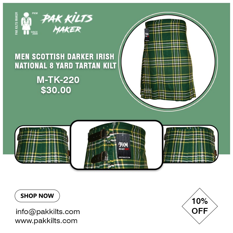 MEN SCOTTISH DARKER IRISH NATIONAL 8 YARD TARTAN KILT MEN SCOTTISH DARKER IRISH NATIONAL 8 YARD TARTAN KILT AUTHOR pakkilts View all posts by pakkilts Pak Kilts working Since 15 Years.We sell wholesale prices to retailers and distributors for resale the items. PAK KILTS is the Official place of Scottish Kilts and Utility kilts in Sialkot. Up to 25 Workers stitch Daily 150 to 200 Kilts.