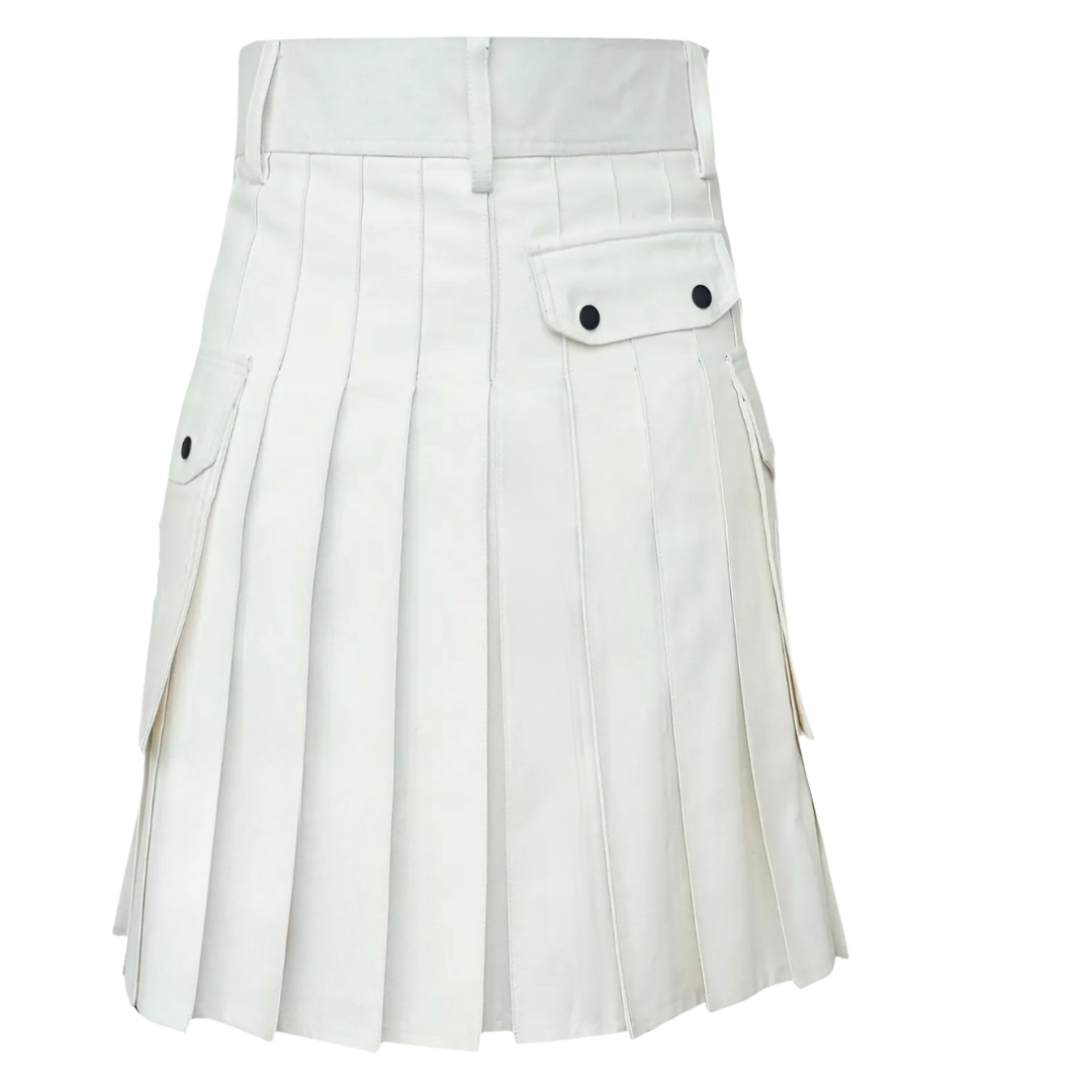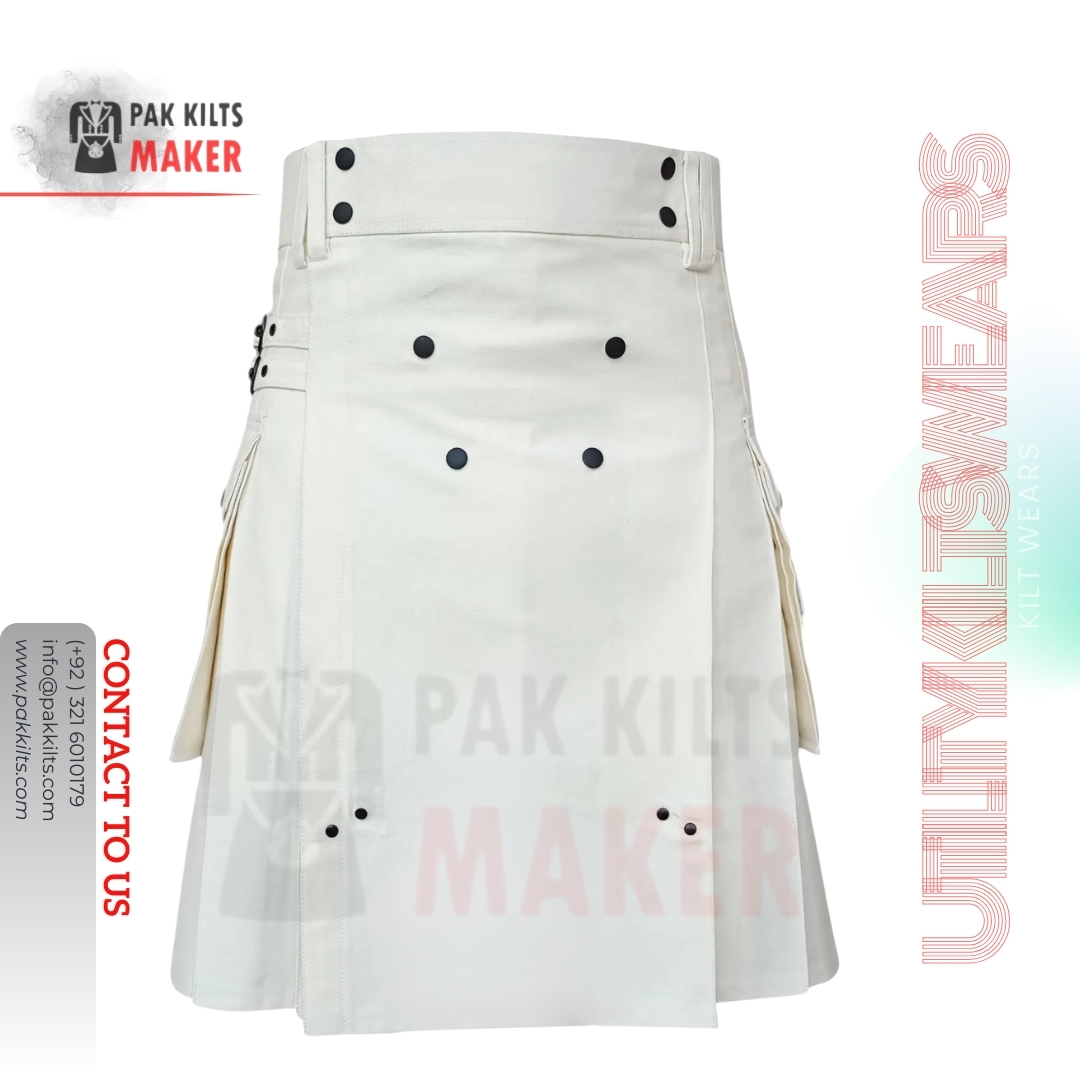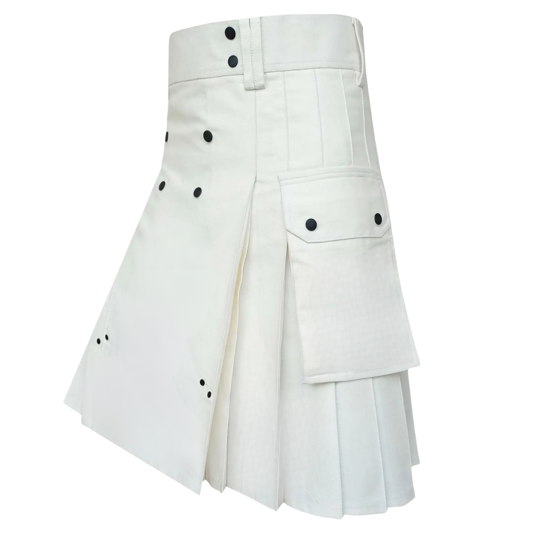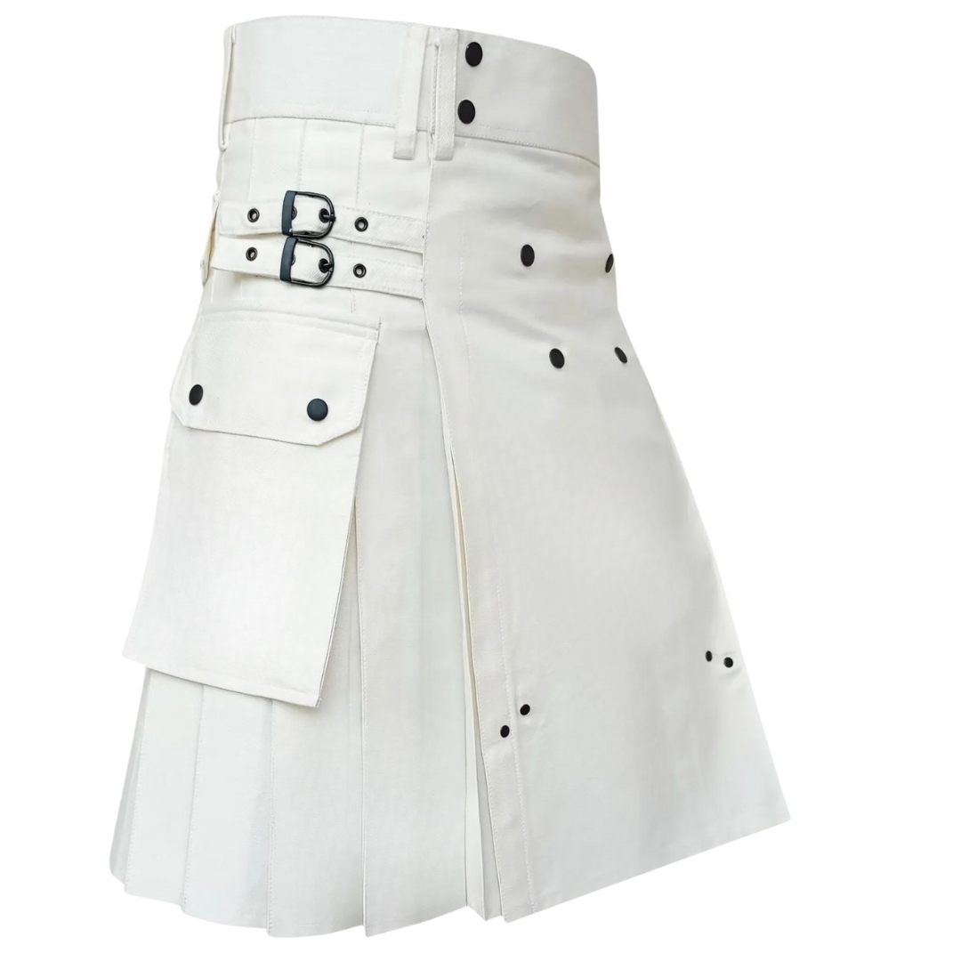 Men’s White Utility Kilt – Heavy-Duty Cotton Kilt with Black Hardware & Adjustable Custom Fit