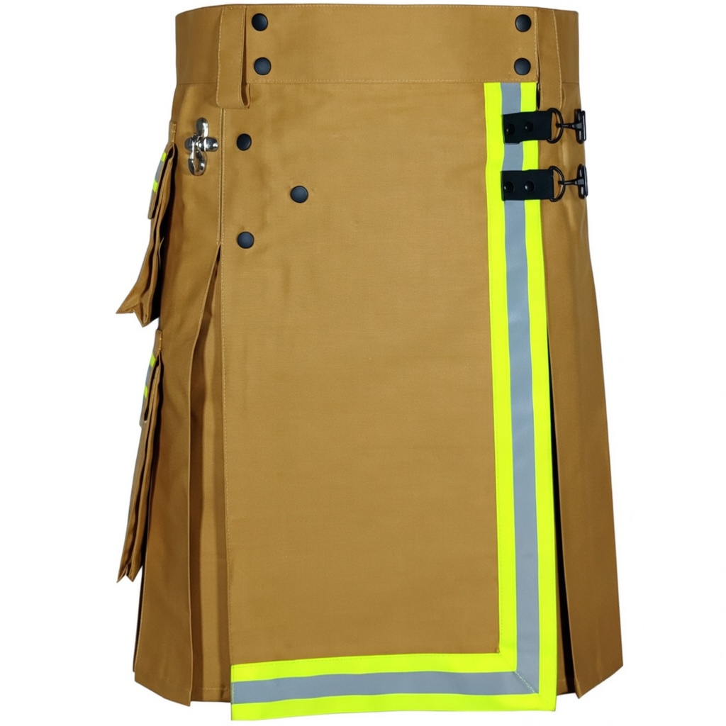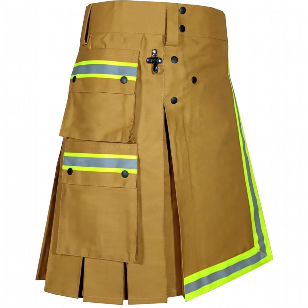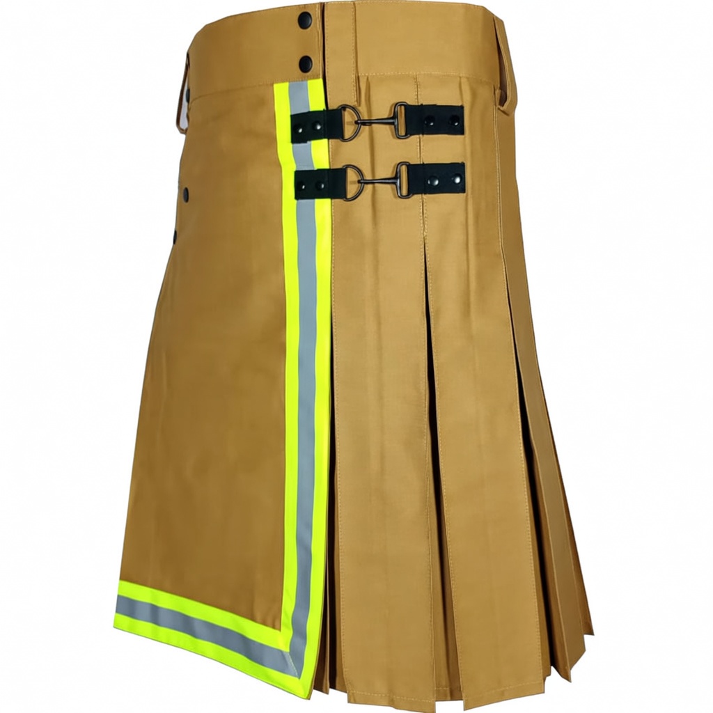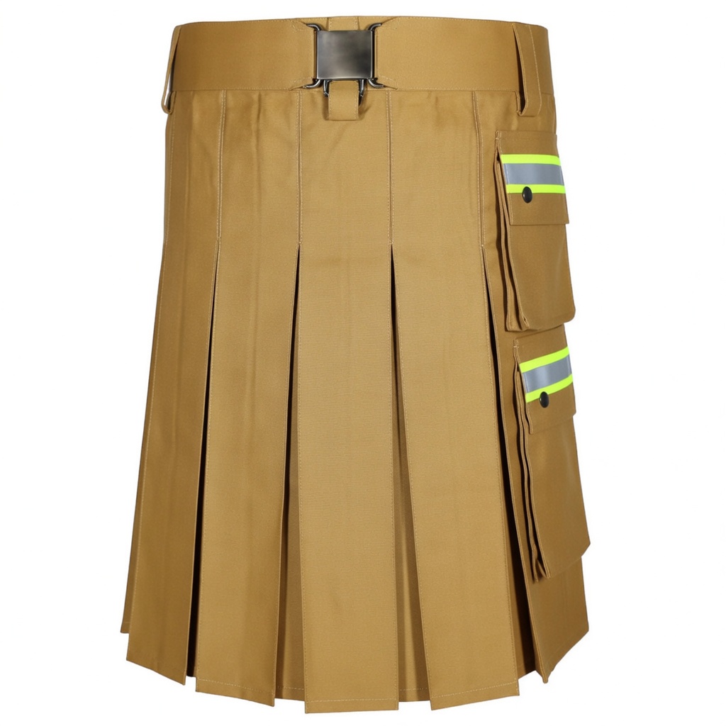Tan Khaki Heavy-Duty Cotton Firefighter Kilt for Men – Reflective Safety Tape Utility Kilt, Durable Workwear Kilt