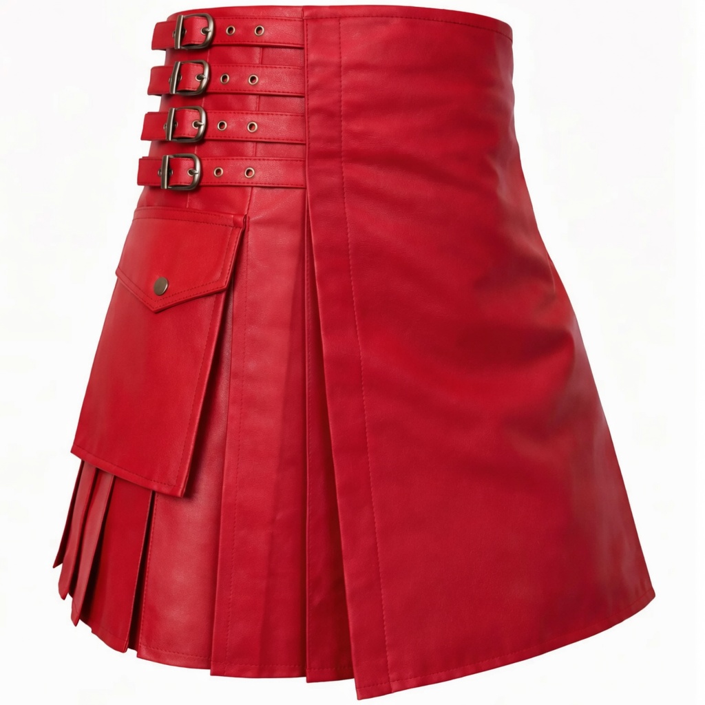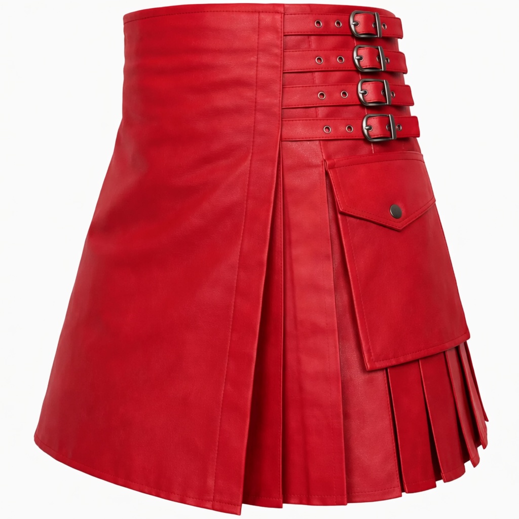 Women’s Red Leather Unisex Kilt – Gothic Pleated Utility Kilt with Buckle Straps